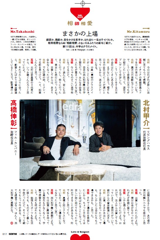 2025.10.28 ライフスタイル誌『ゲーテ12月号』にて、当社取締役会長 髙橋の対談が掲載されました ライフスタイル誌『ゲーテ12月号』の「相師相愛」のコーナーで、当社の取締役会長髙橋と株式会社リビングハウス代表取締役社長 北村 甲介氏との対談が掲載されました。 学生時代や上場時の秘話などが、掲載されています。 一覧に戻る